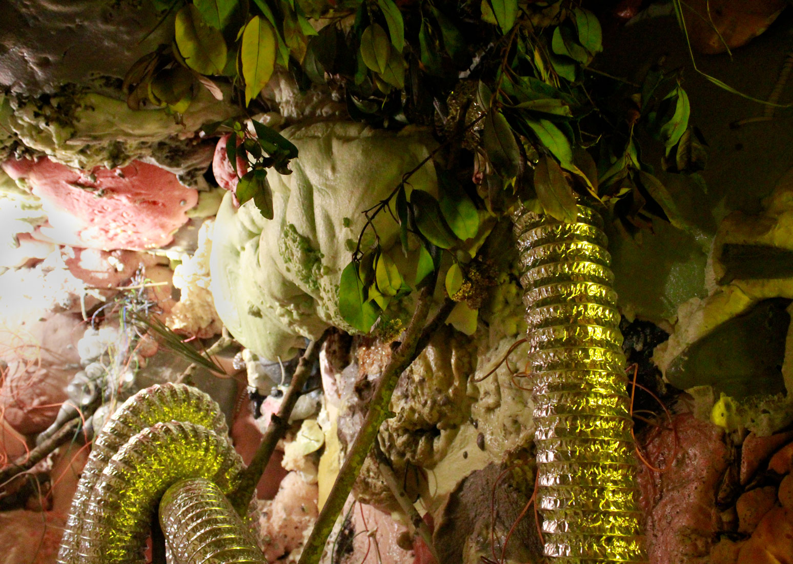 Swimming In The Mud, Terra Nexus, 2021, foam, ducts, living plants, light bulbs, cabling, jesmonite castings, anaglypta wallpaper, wood.